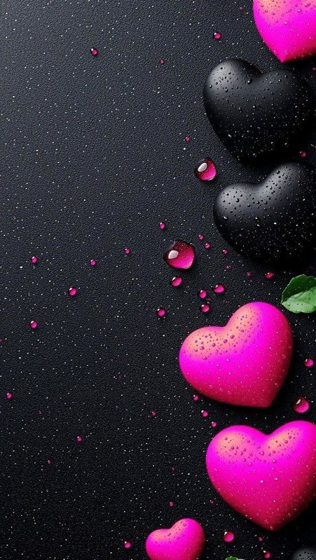 This image is a digital wallpaper featuring a black, textured background with pink hearts and droplets.