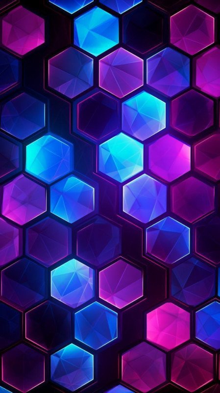 This image is a neon light hexagon pattern honeycomb purple background, often used as a mobile wallpaper.