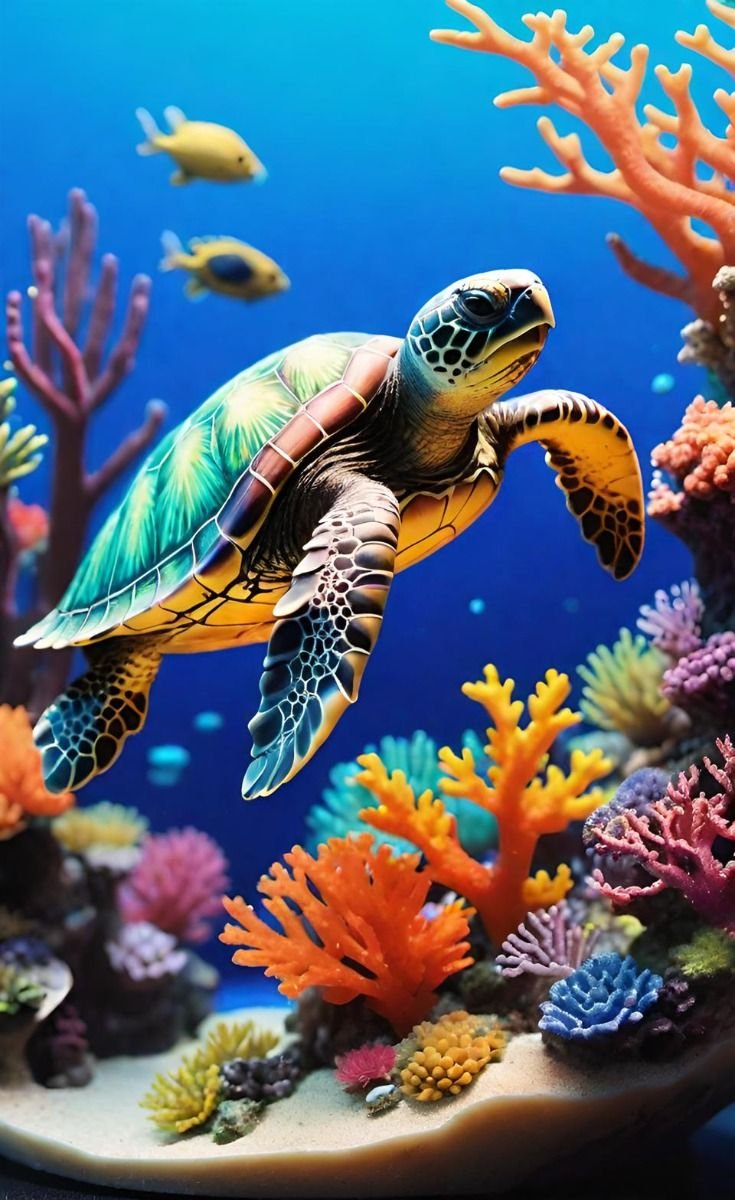 This is an image of a sea turtle swimming in a colorful coral reef.