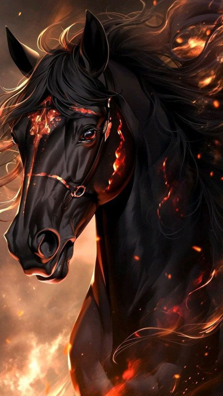 This image is an artistic depiction or digital art of a black horse with fiery elements.