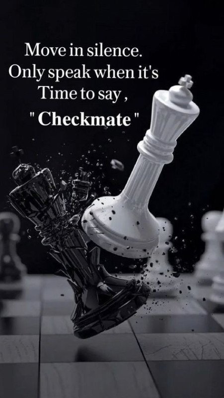 The image displays the motivational quote, "Move in silence. Only speak when it's Time to say, 'Checkmate'", accompanied by a graphic of a white chess king toppling a black king. The quote is a metaphor suggesting one should work quietly towards goals and only announce success when achieved.