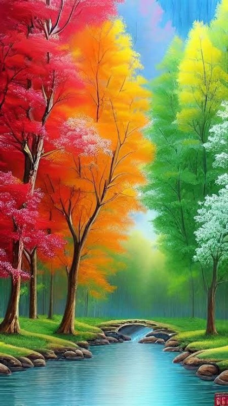 This image is a vibrant, digitally rendered or painted landscape featuring a stream and trees with highly saturated foliage colors.