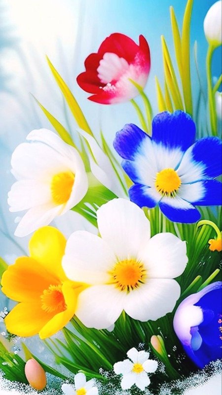 This image features a vibrant assortment of white, yellow, blue, and red flowers, resembling a digital painting or stock photo.