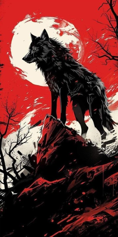The image is a striking digital illustration of a black wolf silhouetted against a crimson red sky with a large white moon. The artwork has a dramatic, graphic novel aesthetic.